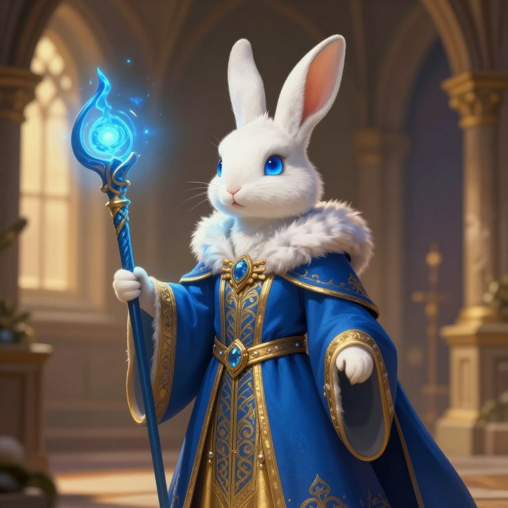 Rabbit demon wearing tattered robes, holding a mystical staff emitting dark energy, surrounded by swirling shadows in a gothic forest, atmospheric and detailed fantasy scene