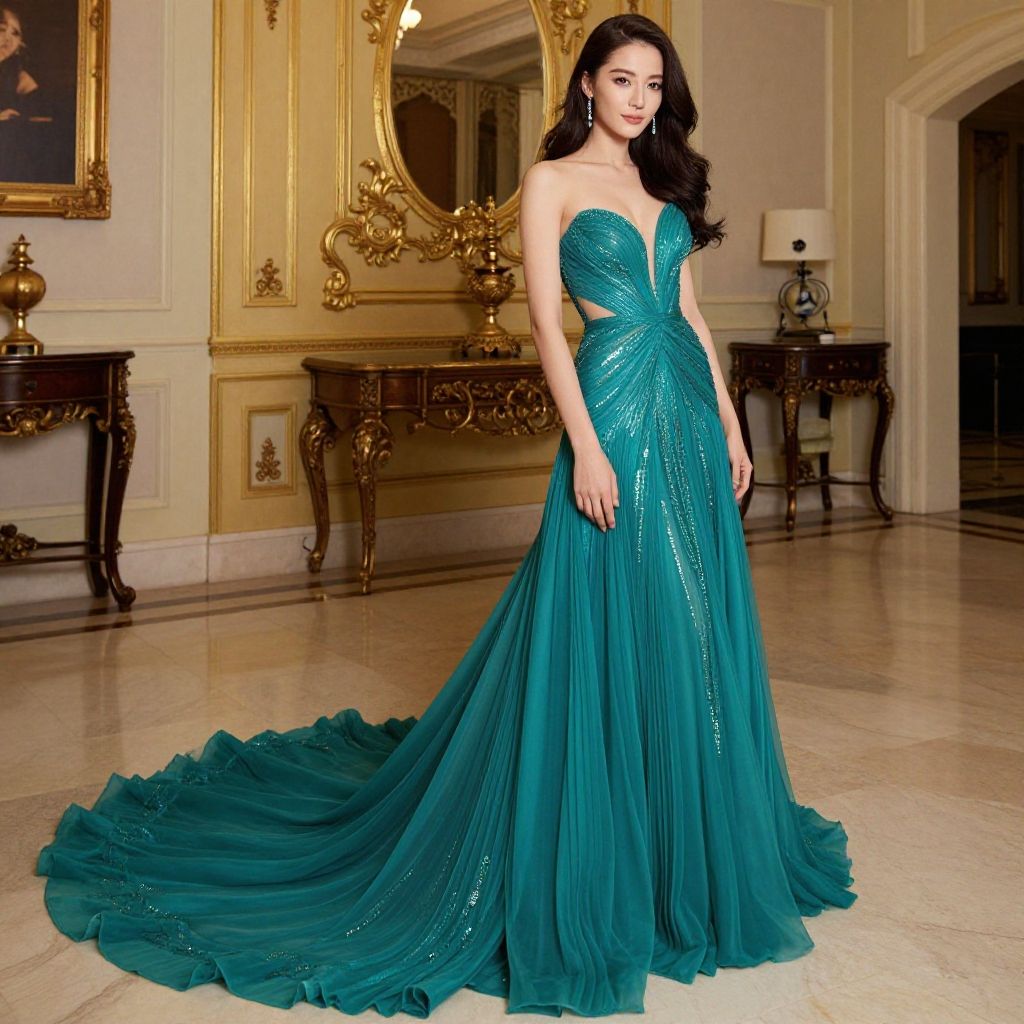 Photograph of a stunning Asian woman in a light blue, one-shoulder, high-slit evening gown with gold belt, standing against a dark