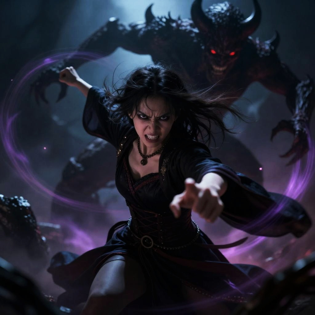 Digital artwork of a fierce, dark-haired woman with glowing blue eyes, dressed in a black, gothic-style dress with lace details and a belt. She is in an aggressive fighting stance, reaching forward with her right arm. Behind her, a menacing, shadowy demon with glowing red eyes and sharp horns looms. Purple, mystical energy swirls around her, adding a supernatural element. The background is dark and misty, enhancing the dramatic and intense atmosphere. The woman's expression is determined and fierce, with her hair flying wildly. The demon's texture is rough and menacing, contrasting with the smooth, dark fabric of the woman's dress.
