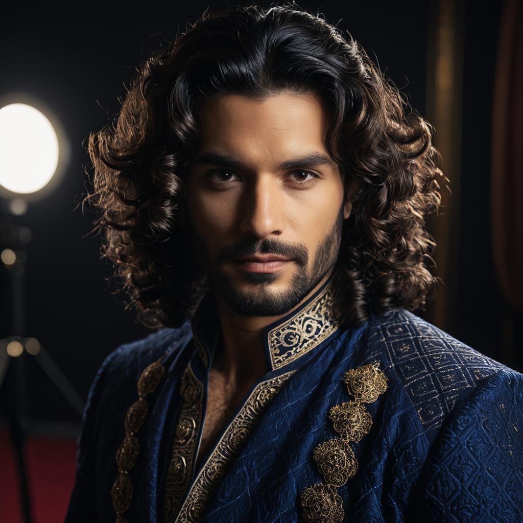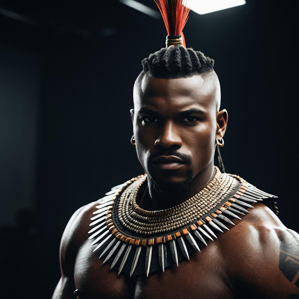 Image-based lighting male photoshoot featuring Zulu warrior posing in a studio setting with shaved sides with a central strip. Rendered in Unreal Engine 4 for realistic and detailed imagery, inspired by professional fashion photography. The design focuses on Sony Alpha 1, close-up portrait, with sharp lighting and precise composition.