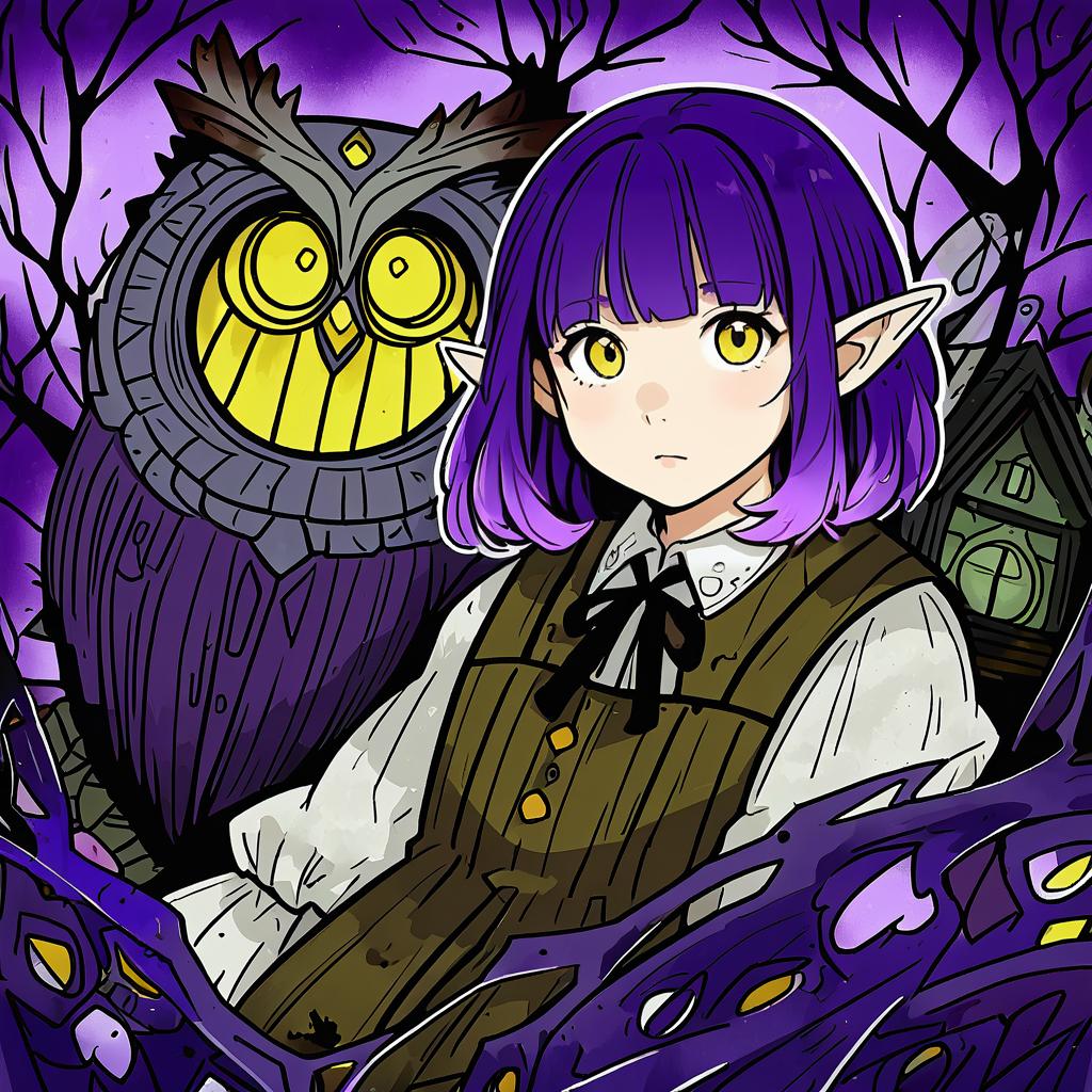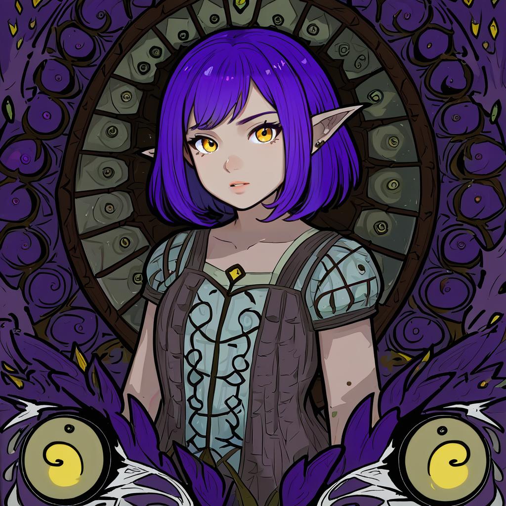 Digital anime-style illustration of a young female character with short purple hair, yellow eyes, and pointed elf ears. She wears a medieval-inspired outfit with a patterned light blue bodice and brown vest. The background features intricate designs and eye motifs in dark purple and green shades.
