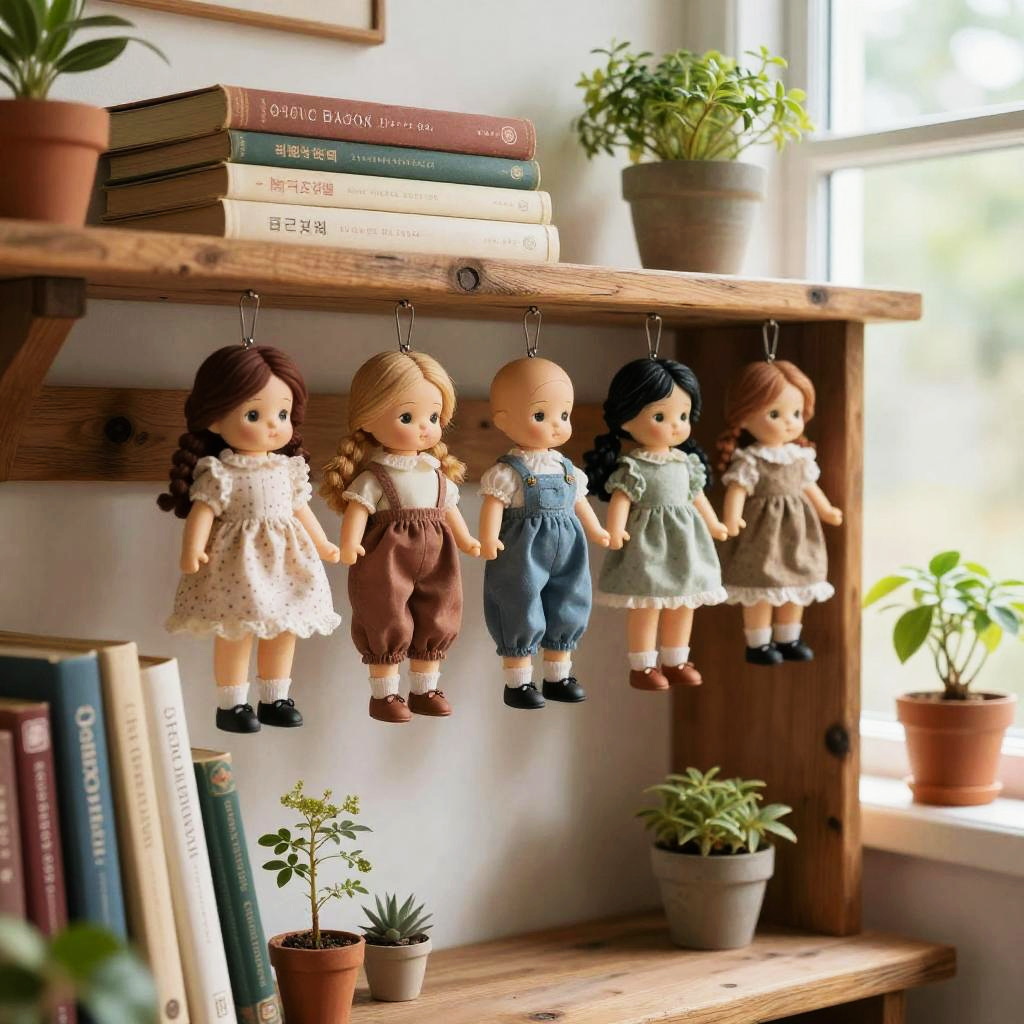 A group of dekopin dolls hanging off a rustic wooden shelf, surrounded by books and small plants, natural daylight streaming through a window, emphasizing the quaint and nostalgic atmosphere, soft bokeh background, intricate textures on the figurines and environment.