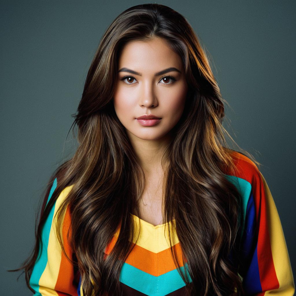 Portrait of a young woman with long brown hair and brown eyes wearing a multicolored costume inspired by the Twister game. She has smooth skin and natural makeup, posing against a simple gray background. The costume features bright stripes in orange, yellow, teal, blue, and red.