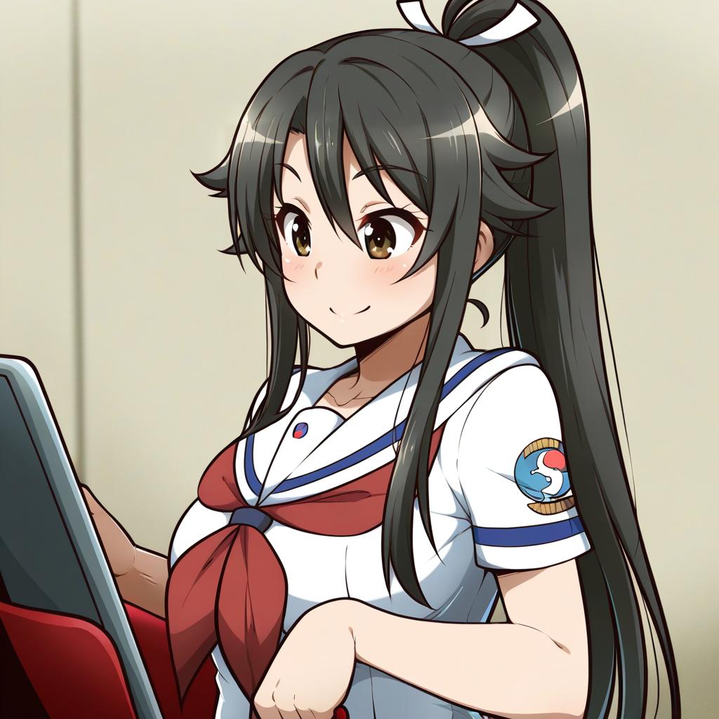 Munetani mashiro, high school fleet, 1girl, red eyes, black hair, long hair, ponytail, sidelocks, hair ribbon, medium breasts, yokosuka girls marine high school uniform, serafuku, yokosuka girls marine high school uniform, serafuku, short sleeves, by artist kuroshinki, illustrious