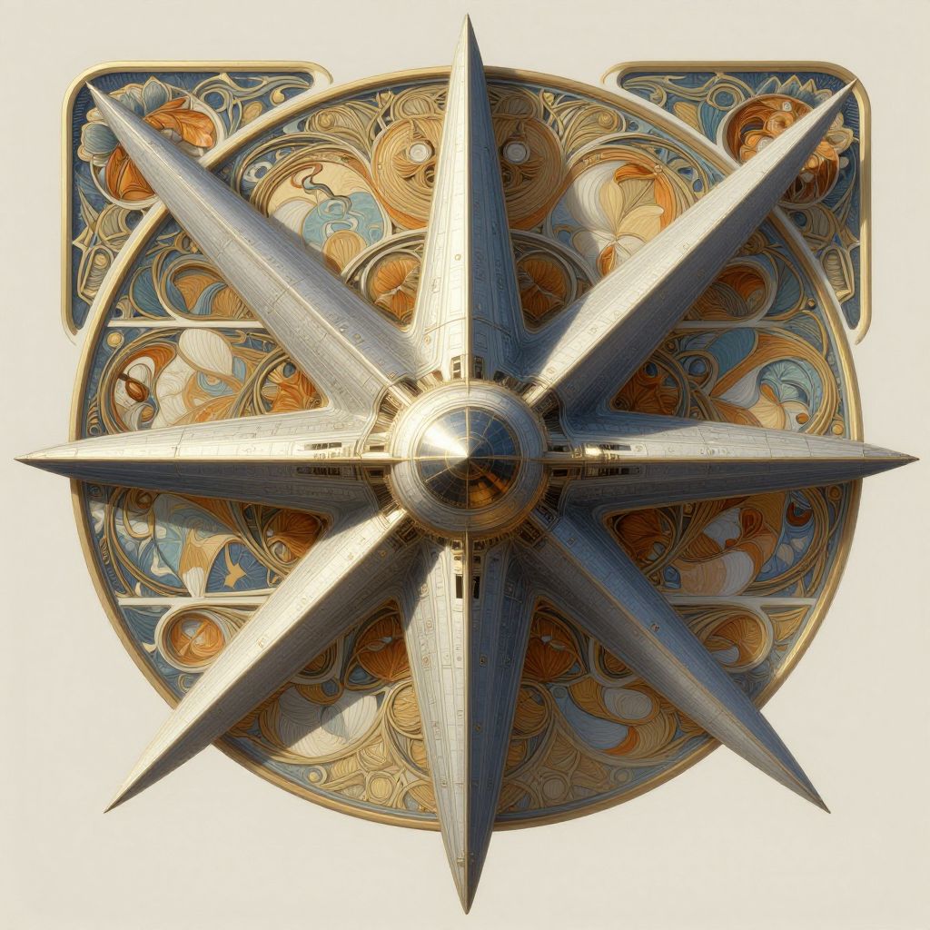 Digital artwork of a metallic, silver starburst with sharp points, centered on an ornate, circular background with intricate, golden and blue swirls and