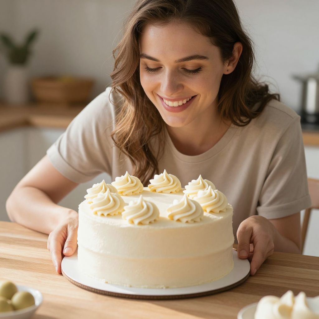 Woman smiling warmly as she admires a freshly frosted vanilla cake with six piped swirls on top, set on a wooden kitchen counter bathed in natural sunlight.
