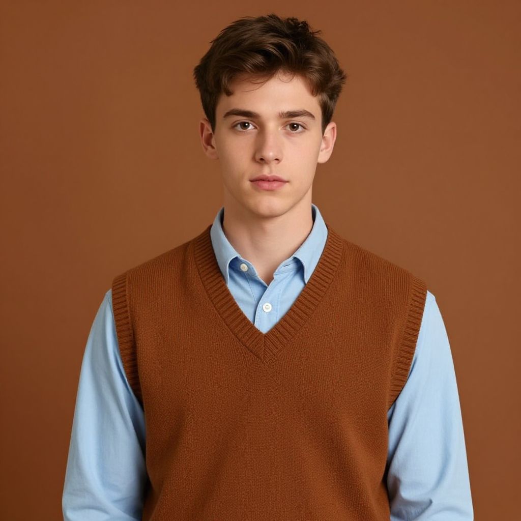 Portrait of a young man with short brown hair wearing a light blue button-up shirt underneath a brown knit vest. The image is styled in a 90s retro fashion with a solid brown background, capturing a casual and nostalgic look.