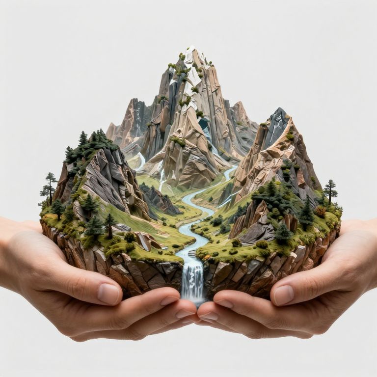 Two hands cradle a miniature, intricately carved landscape of towering peaks and cascading valleys, defying scale and gravity in a surreal, portable world.