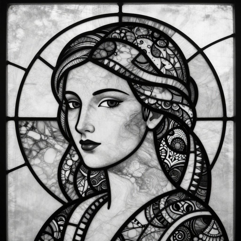 A black and white geometric stained glass artwork featuring a woman's head with intricate marble patterns.