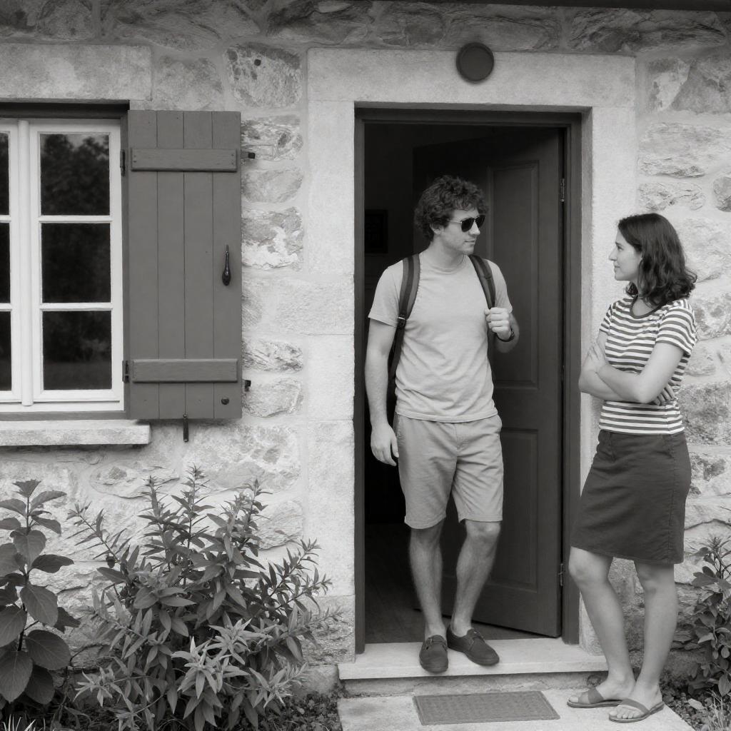 Black and white photograph of a man and woman standing outdoors. Man in light shirt, shorts, and belt, hands on hips, smiling. Woman in dark polka dot dress, white apron, hands on hips, looking back. Large barrel on right with "Mona Lisa" sign. Tropical plants in background. Man's short hair, woman's curly hair. Both standing on dirt path.