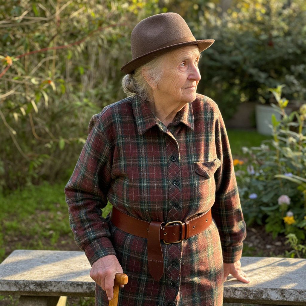 An elderly woman with kind, wise eyes and silver hair gently tied in a loose bun, wearing a warm brown felt hat with a small brim, a classic vintage plaid shirt in faded red and green tones, and a sturdy brown leather belt snugly around her waist. She stands in a sunlit garden, holding a wooden walking cane, her hands resting on a weathered stone bench, with soft golden light casting gentle shadows across the scene. The atmosphere is peaceful and nostalgic, capturing a sense of quiet dignity and quiet strength.