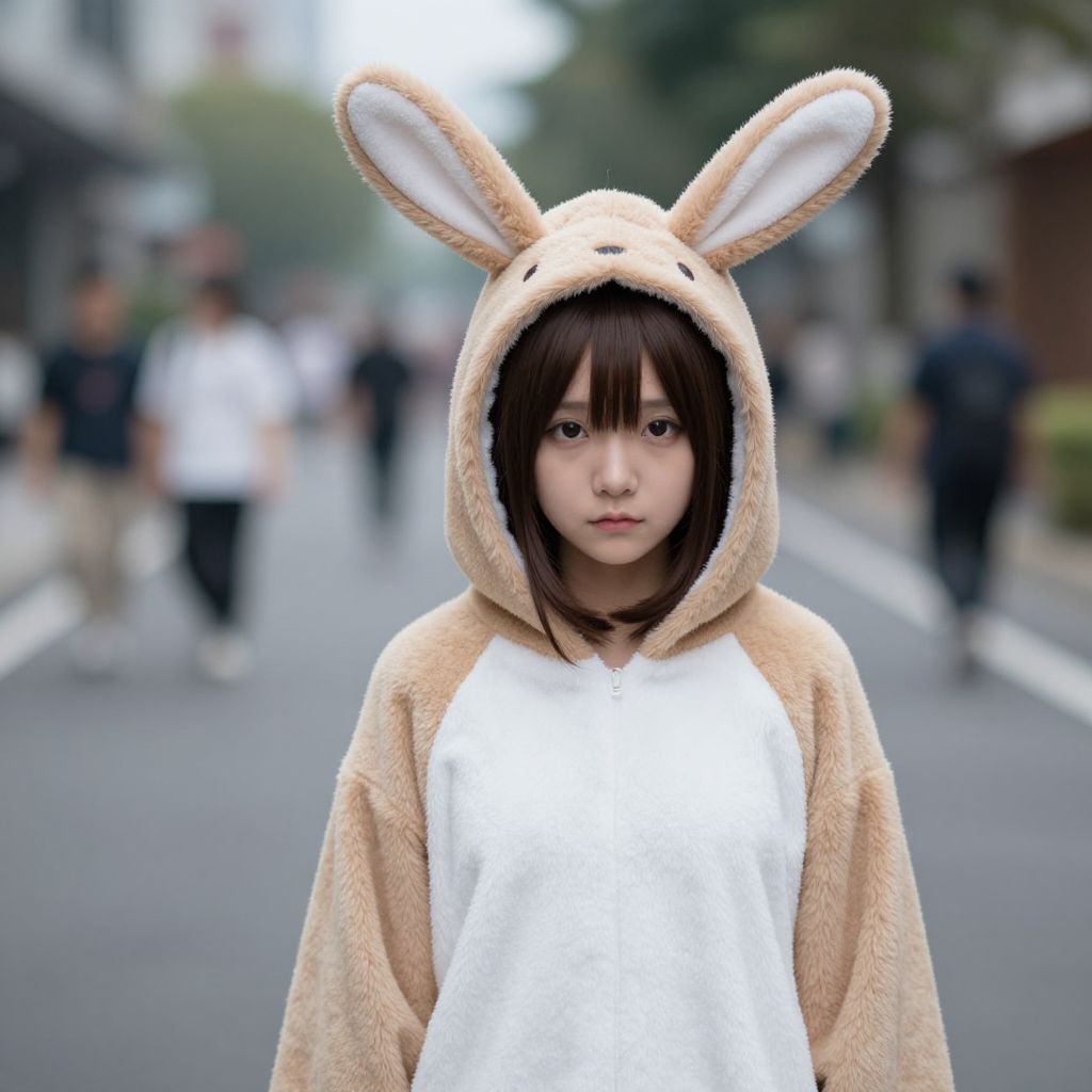 Photograph of an East Asian young woman standing on an urban street, slightly blurred background with pedestrians. She wears a beige and white plush bunny costume with large, upright ears, and her straight brown hair peeks out from under the hood. Her expression is neutral, with a slight gaze towards the camera. The background shows a city street with trees and buildings, with people in the distance. The costume has a soft, fuzzy texture, contrasting with the smooth asphalt and concrete of the street. The image has a slightly surreal, digital effect.