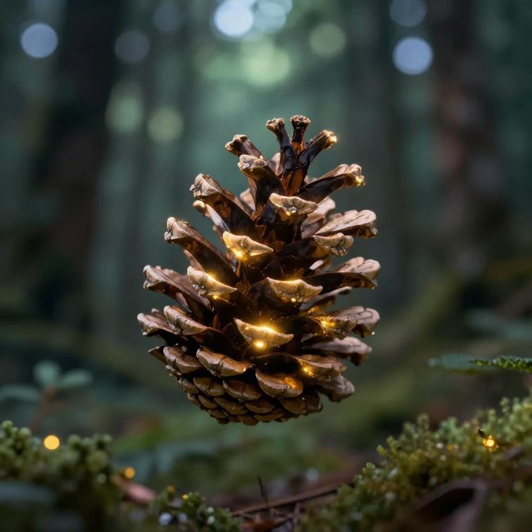 A luminous pinecone floats serenely amidst a mystical forest, its scales aglow with golden light, defying gravity and inviting wonder into the enchanted woodland.