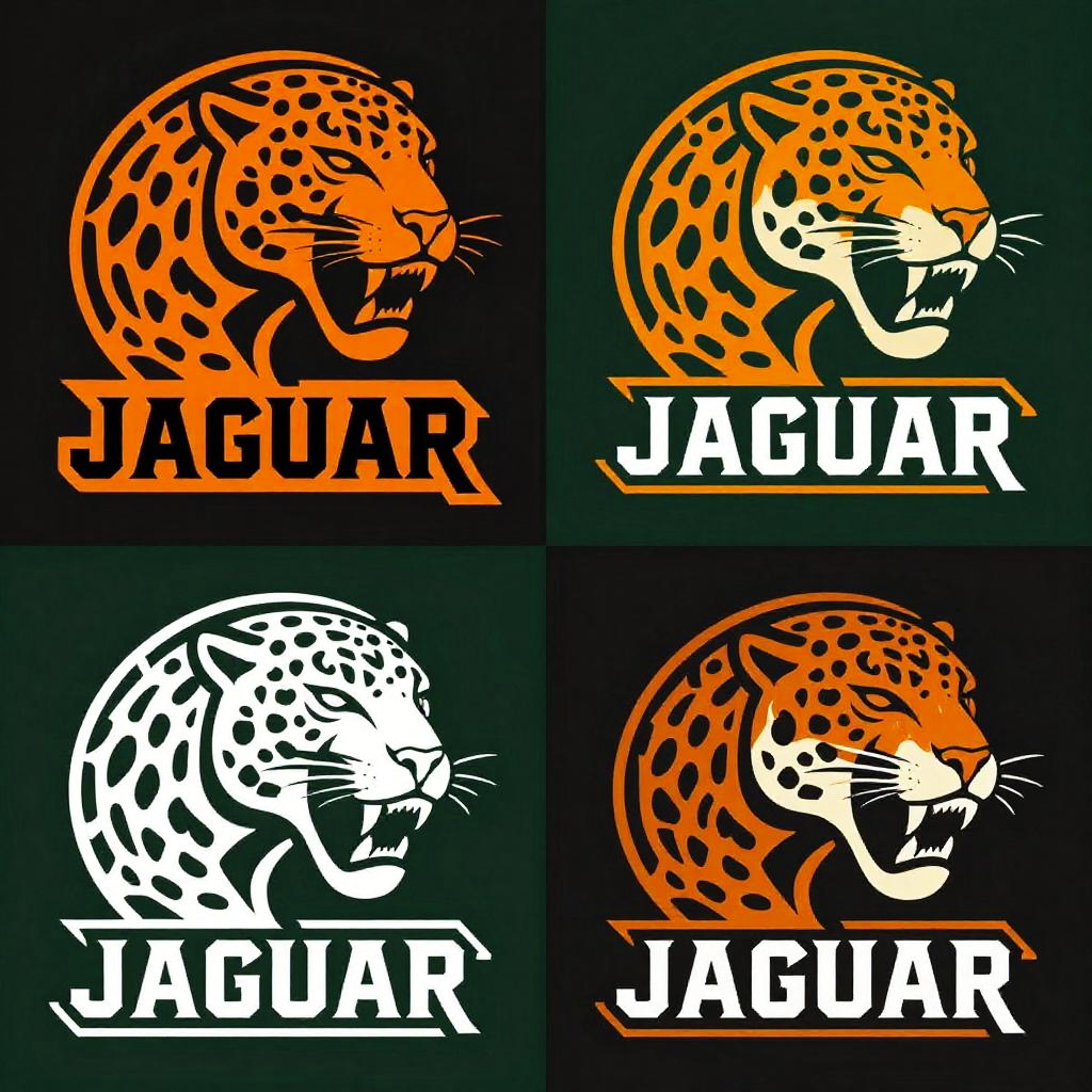 Digital illustration of four "Jaguar" logos, each with an orange and black or white and black jaguar head, showing different color schemes and