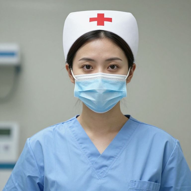 Photograph of an Asian woman with fair skin and black hair, wearing a white nurse's cap with a red cross, a blue surgical mask, and light blue medical scrubs. Her brown eyes are centered in the frame, and she is standing against a blurred, neutral-colored background with indistinct medical equipment. The image is sharply focused on her face and upper body, emphasizing her professional attire and serious expression. The lighting is bright and even, highlighting the medical theme.