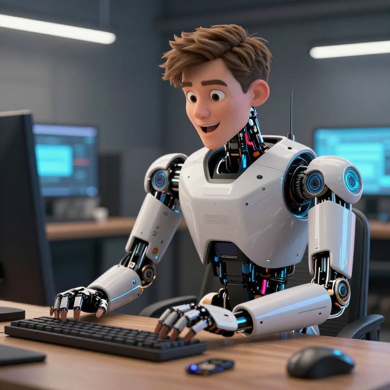 CGI image of a happy, brown-haired, cartoon-style, male robot with white and black metallic body, typing on a keyboard in a modern office