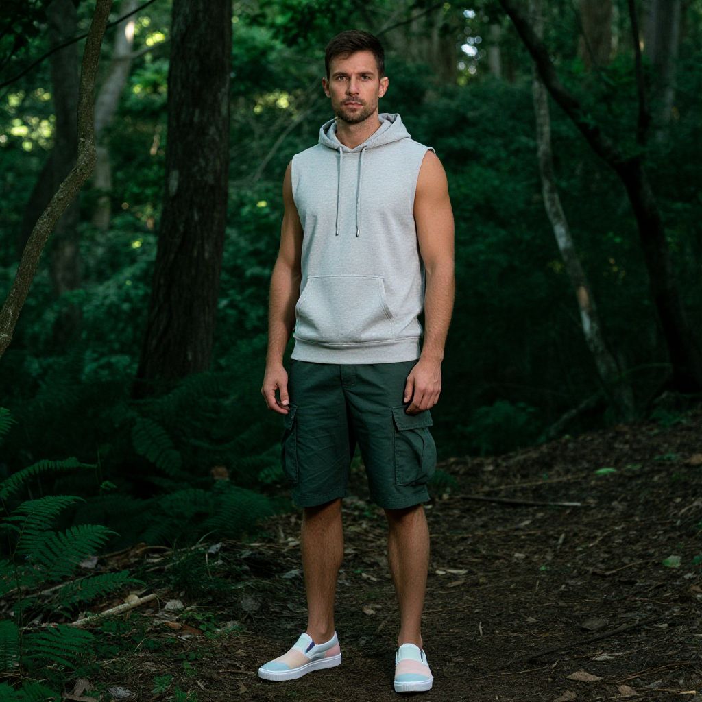 A man, light gray sleeveless hoodie, dark green cargo shorts, trendy pastel slip-on sneakers, fitted athletic undershirt, dense forest canopy, dappled sunlight, serene expression, cinecolor style. Man has masculine face and piercing eyes