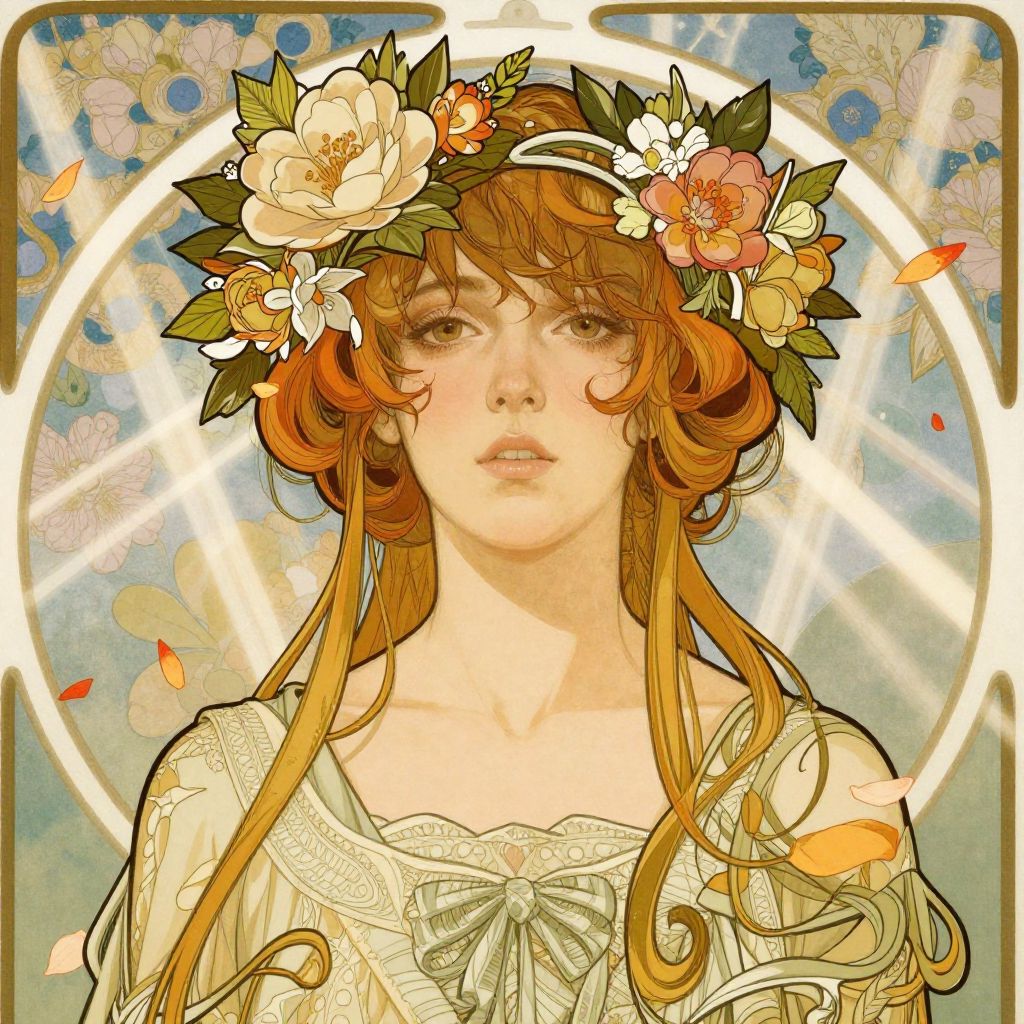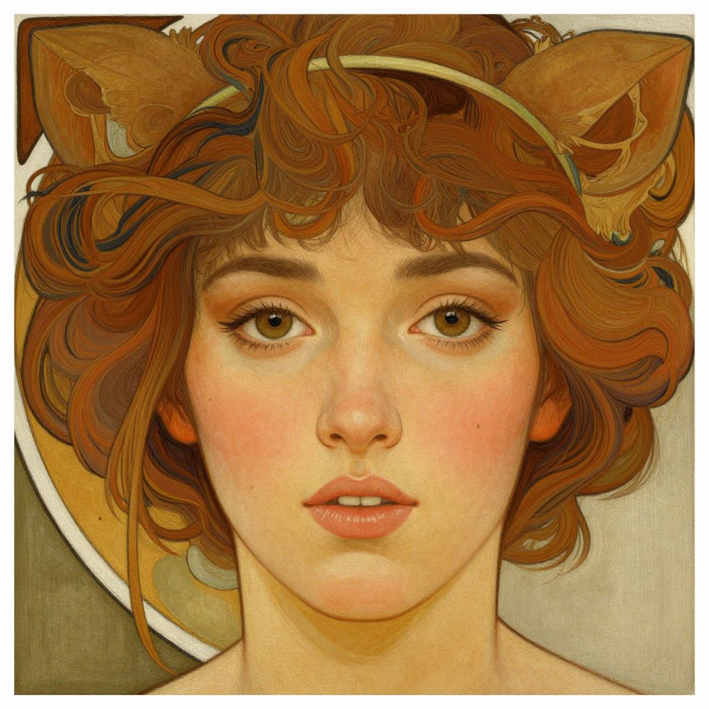 Digital painting of a young woman with curly auburn hair, cat ears, and large brown eyes, staring directly forward with soft, pink lips.