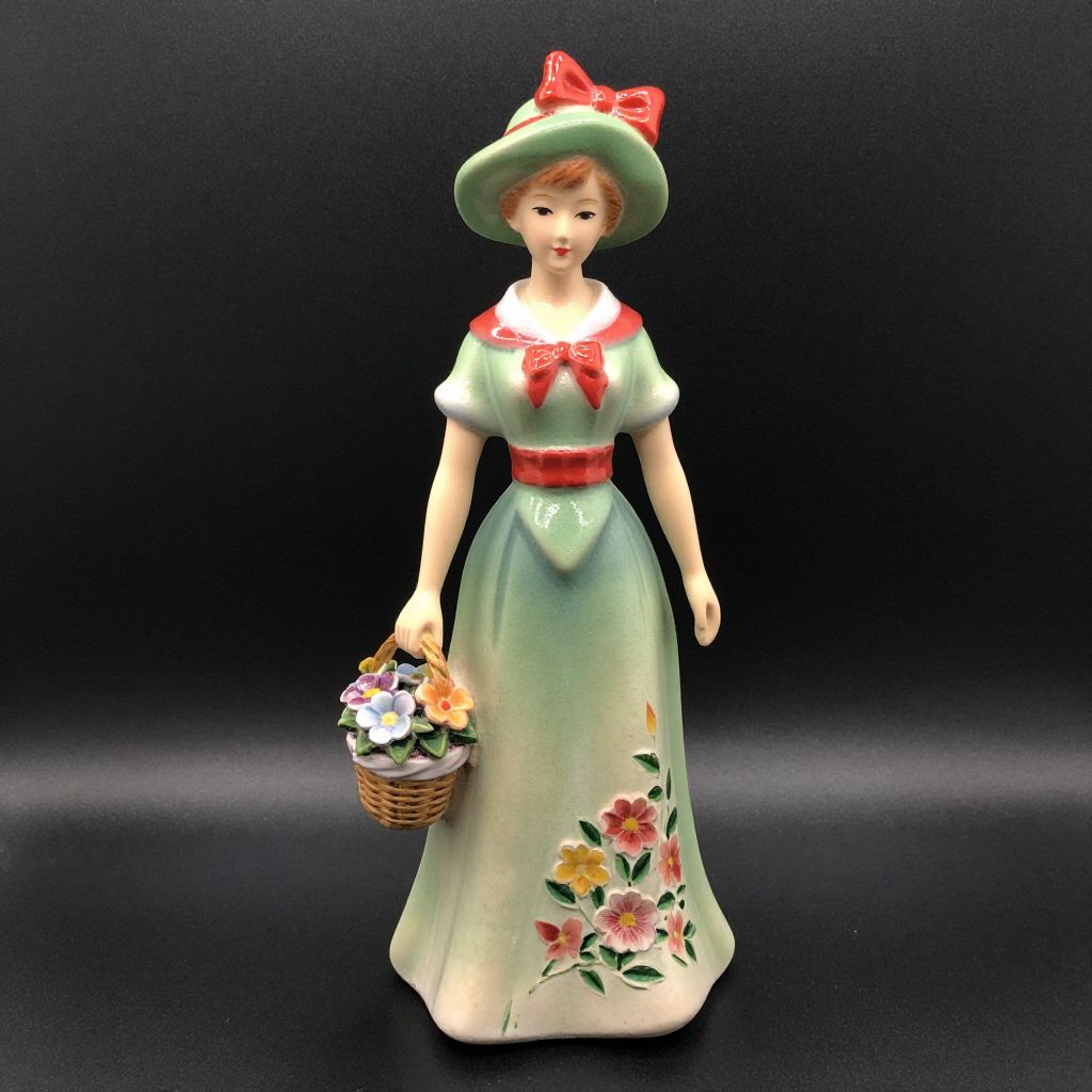 Occupied Japan Figurine Gorgeous figurine Woman with basket of flowers Measures approximately 6 1/2 tall Green hat with bow Red accent Green dress with flowers Occupied Japan Great addition to any collection Perfect gift idea for the holiday season, hostess gift, housewarming gift I take great care to package and ship your vintage treasures in a secure and timely manner. These items are vintage and as such may have some wear and tear in prior use. Items will arrive cleaned. See my ot...