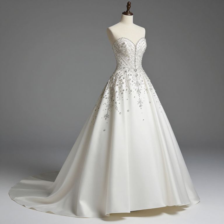 A white wedding dress adorned with diamonds and a flowing train, displayed on a mannequin.