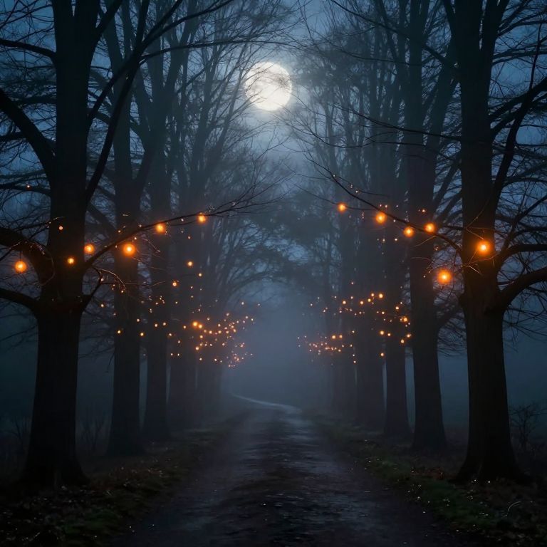 Mist-shrouded trees stand tall along a winding path, their bare branches adorned with glowing orange orbs that seem to dance in the moonlit night, creating an ethereal and otherworldly scene.