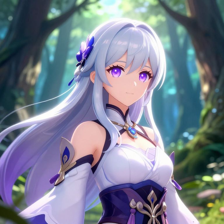 Violet eyes anime character standing in a mystical forest, soft glowing light filtering through ancient trees, detailed delicate facial features, flowing silver hair, intricate fantasy outfit with ethereal vibes, highly detailed anime style, vibrant colors