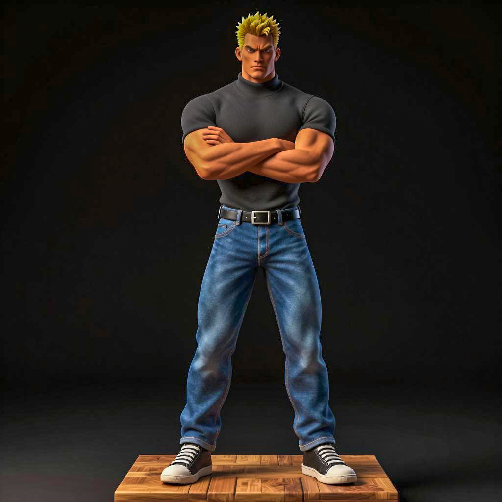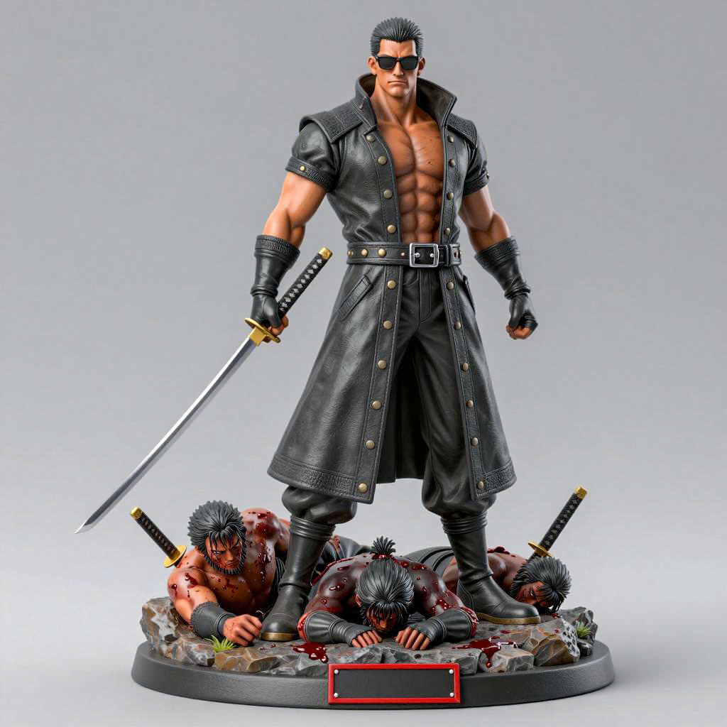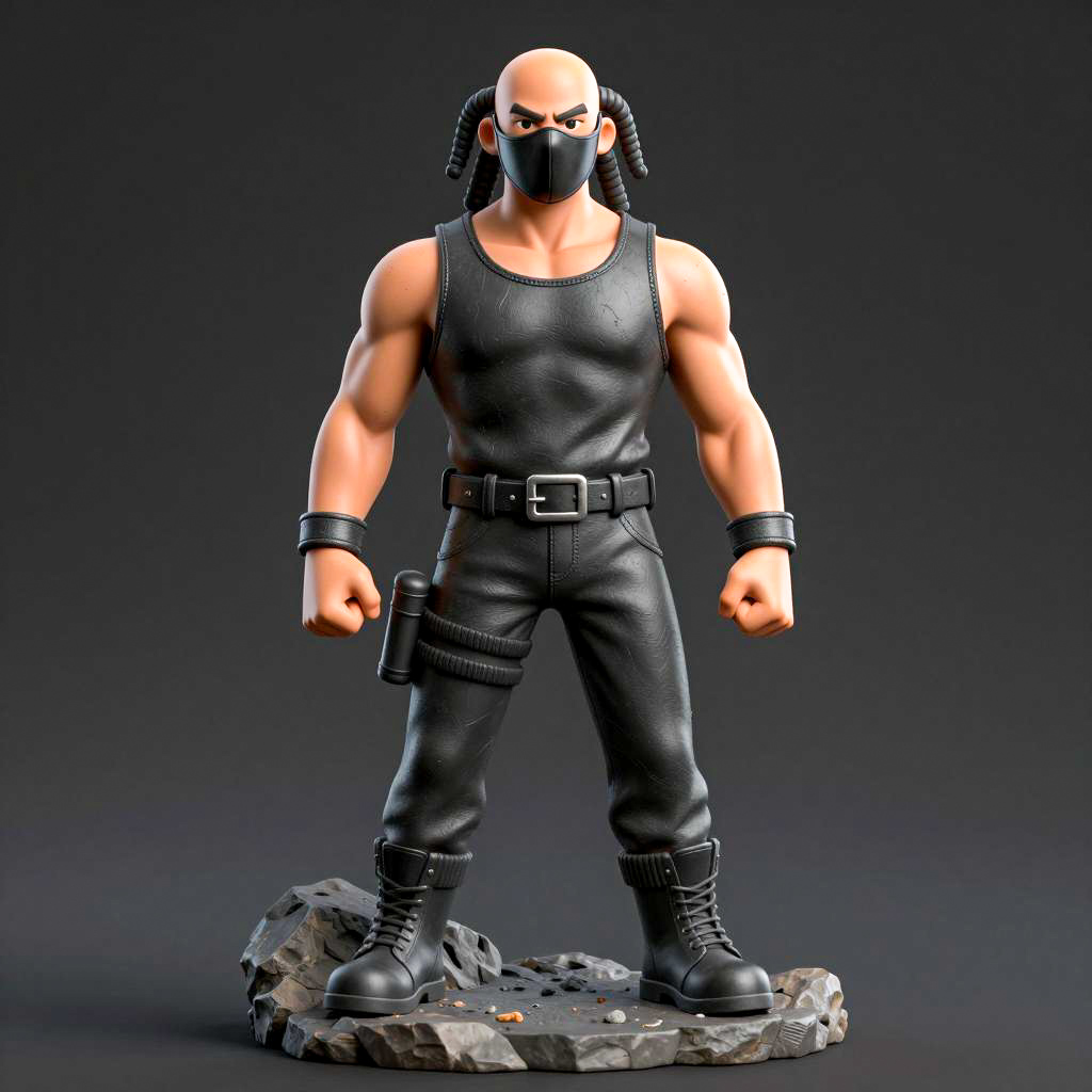 Muscular bald man with dark skin, wearing black leather eyepatch, long coat, black shirt, pants, and boots. Standing with fists clenched, one foot on a metallic surface with a cracked object. Dark gray background. Realistic digital illustration. Intense expression. Long coat has ured, distressed look. Boots have detailed, rugged design. Pants have multiple pockets. Single character, full body, front view.