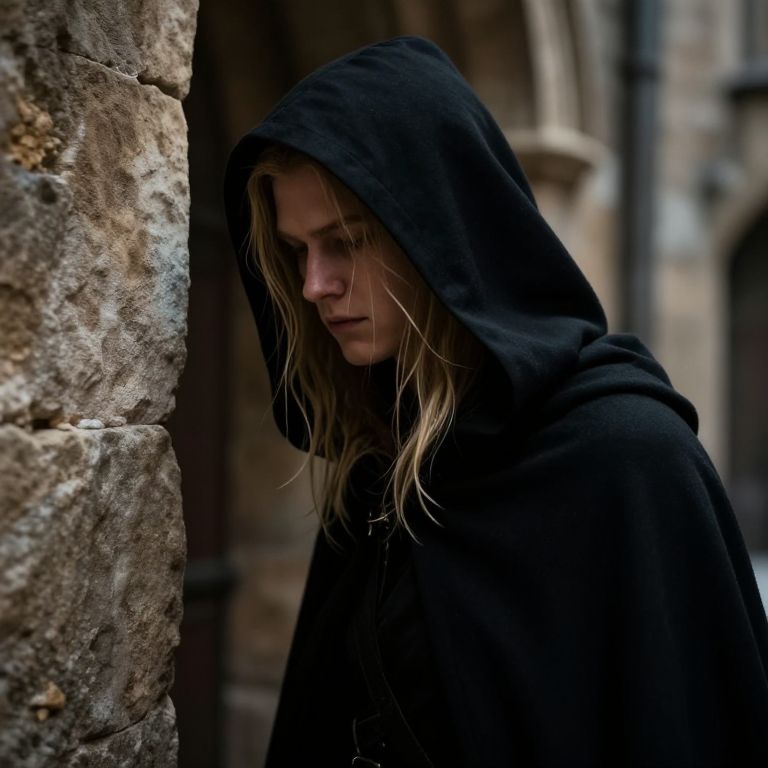 Close-up of a rogue with blonde hair slipping through shadows in an ancient medieval city, wearing a black hooded cloak, soft light highlighting strands of hair, detailed texture on weathered stone walls, atmospheric and cinematic.