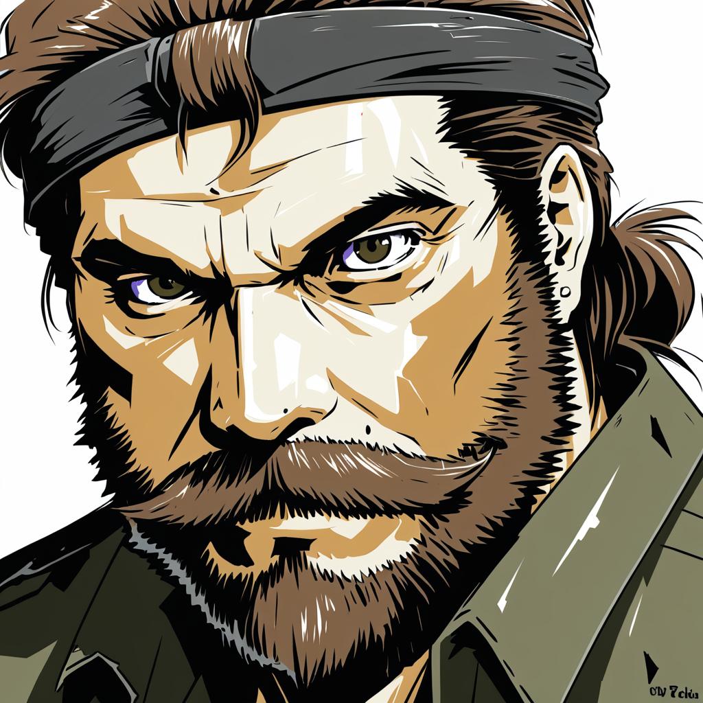 Digital anime-style illustration of a serious bearded man with brown hair tied back, wearing a dark headband. The character has intense greenish eyes, a thick mustache, and a full beard. He is dressed in a military-style jacket and has an earring in one ear. The style is inspired by the character Big Boss from the Metal Gear series.