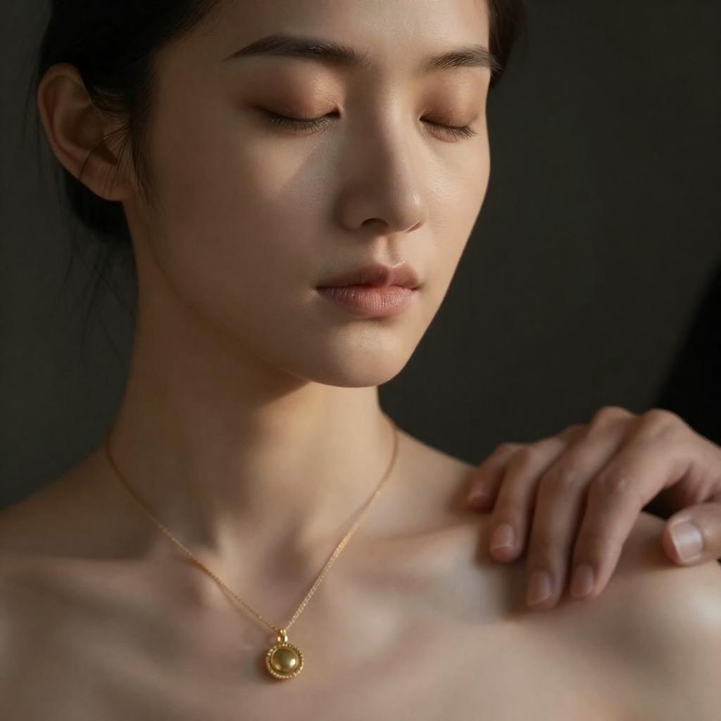 Close-up photograph of a light-skinned woman with closed eyes, wearing a gold necklace, her face partially illuminated by light. A man's hand gently touches her shoulder. Her expression is serene. Golden light creates a soft glow. Background is dark.
