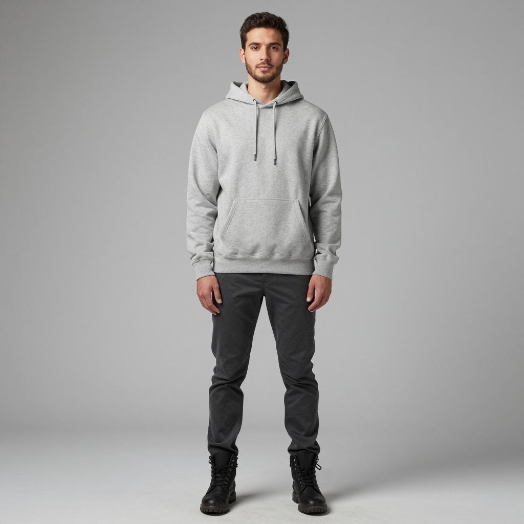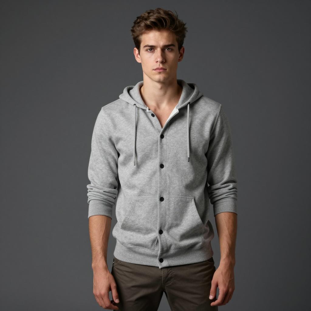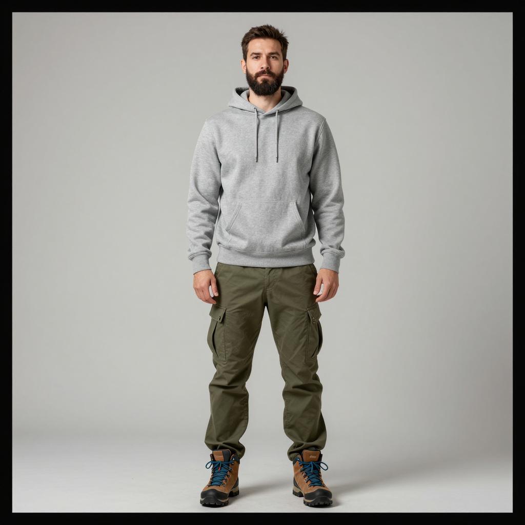 Candy cane suit man costume, photograph of a young man, standing, front view, wearing red and white diagonal striped hoodie, hood up, hands in pockets, olive green pants, brown sneakers, gray background, neutral expression, studio lighting, casual style, realistic, clear details, full body shot, slightly tilted head, slight shadow under feet