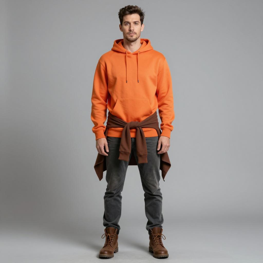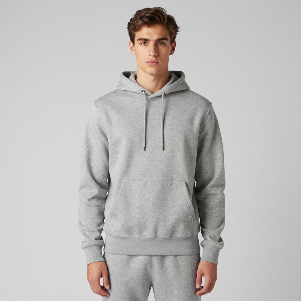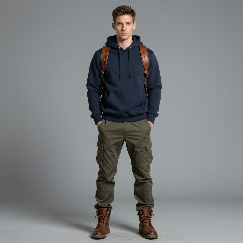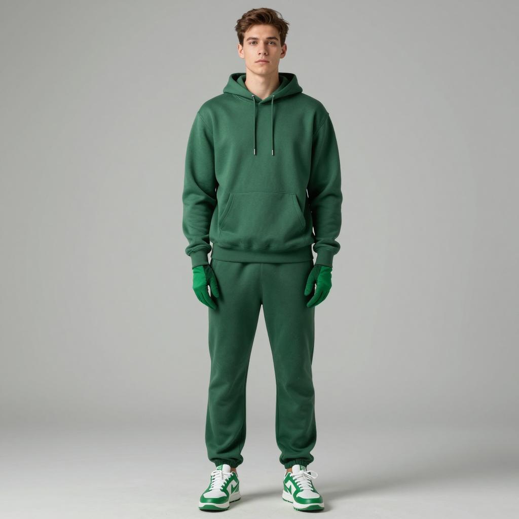 Candy cane suit man costume, photograph of a young man, standing, front view, wearing red and white diagonal striped hoodie, hood up, hands in pockets, olive green pants, brown sneakers, gray background, neutral expression, studio lighting, casual style, realistic, clear details, full body shot, slightly tilted head, slight shadow under feet