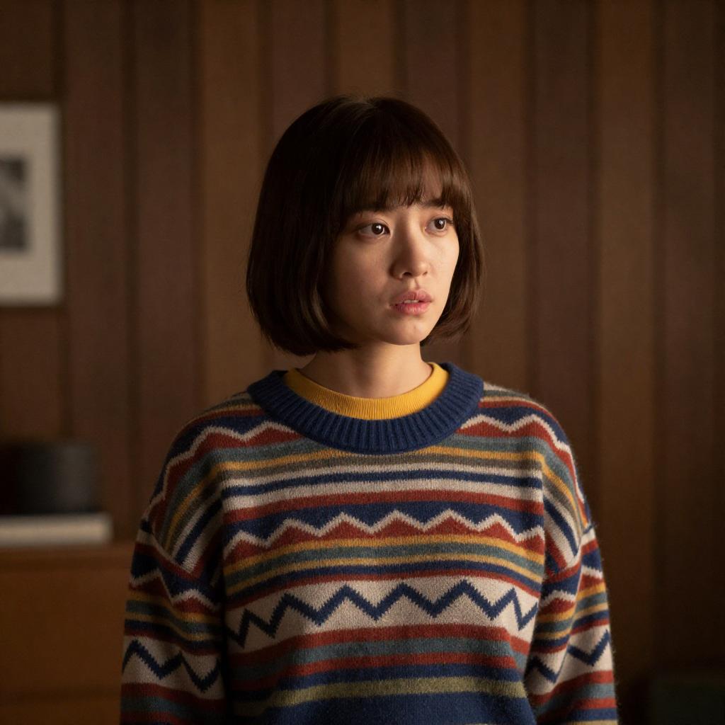 Young woman with short brown hair, wearing a striped brown and blue long-sleeve shirt and a multi-colored, flowy skirt, steps barefoot through an open dark wooden door. Sunlight from outside illuminates her serious expression. Background includes green trees and a red building. String lights hang above the door frame. She has a slight forward lean, with arms outstretched for balance.