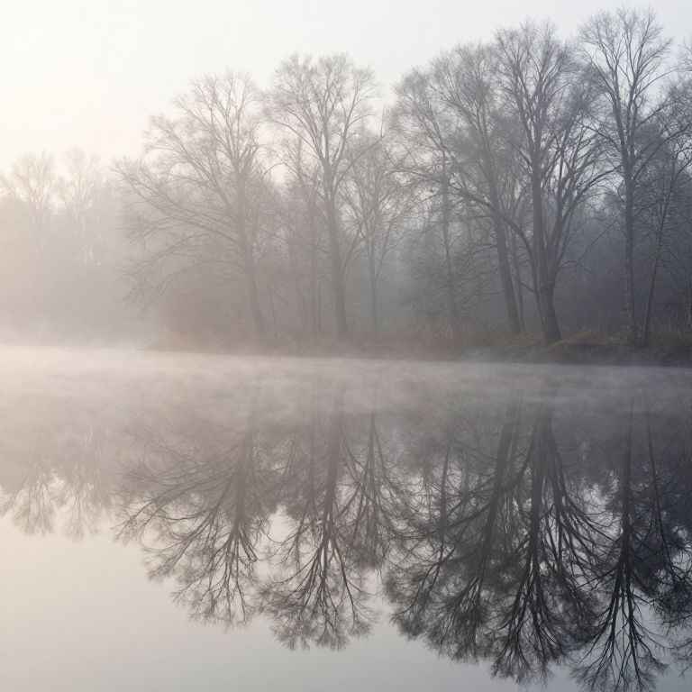 Photograph of a serene, foggy lakeside scene in early morning light. Bare, leafless trees with intricate, dark branches stand along the mist-covered shoreline, their reflections mirrored perfectly in the calm, glass-like water. The soft, diffused light creates a hazy, ethereal atmosphere, blurring the background and enhancing the tranquil, almost ghostly ambiance. The mist and reflections create a symmetrical, almost mirror-image effect, emphasizing the stillness and quiet of the natural setting. The overall color palette is muted, with shades of gray, white, and subtle hints of blue.