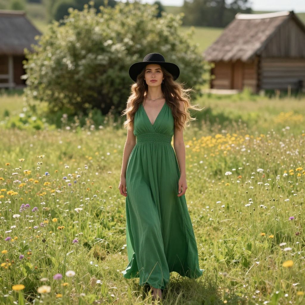A woman with warm brown hair, gently flowing in the breeze, is wearing a vibrant green outfit that includes a green dress with floral patterns, paired with green boots and a green cap resting on her head. She stands confidently in a sun-drenched meadow, smiling warmly at the camera, with soft golden light casting a gentle glow around her. The background features a serene landscape of rolling hills and a distant tree line, adding a natural and peaceful atmosphere.
