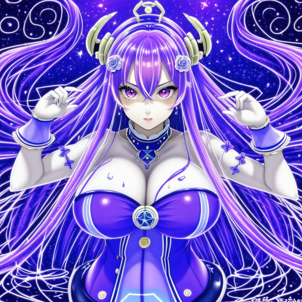 Akiyama rinko, taimanin (series), 1girl, purple eyes, hair between eyes, blue hair, very long hair, purple hair, long hair, ponytail, large breasts, huge breasts, cleavage, taimanin suit, purple bodysuit, by artist ryouka (suzuya), anime