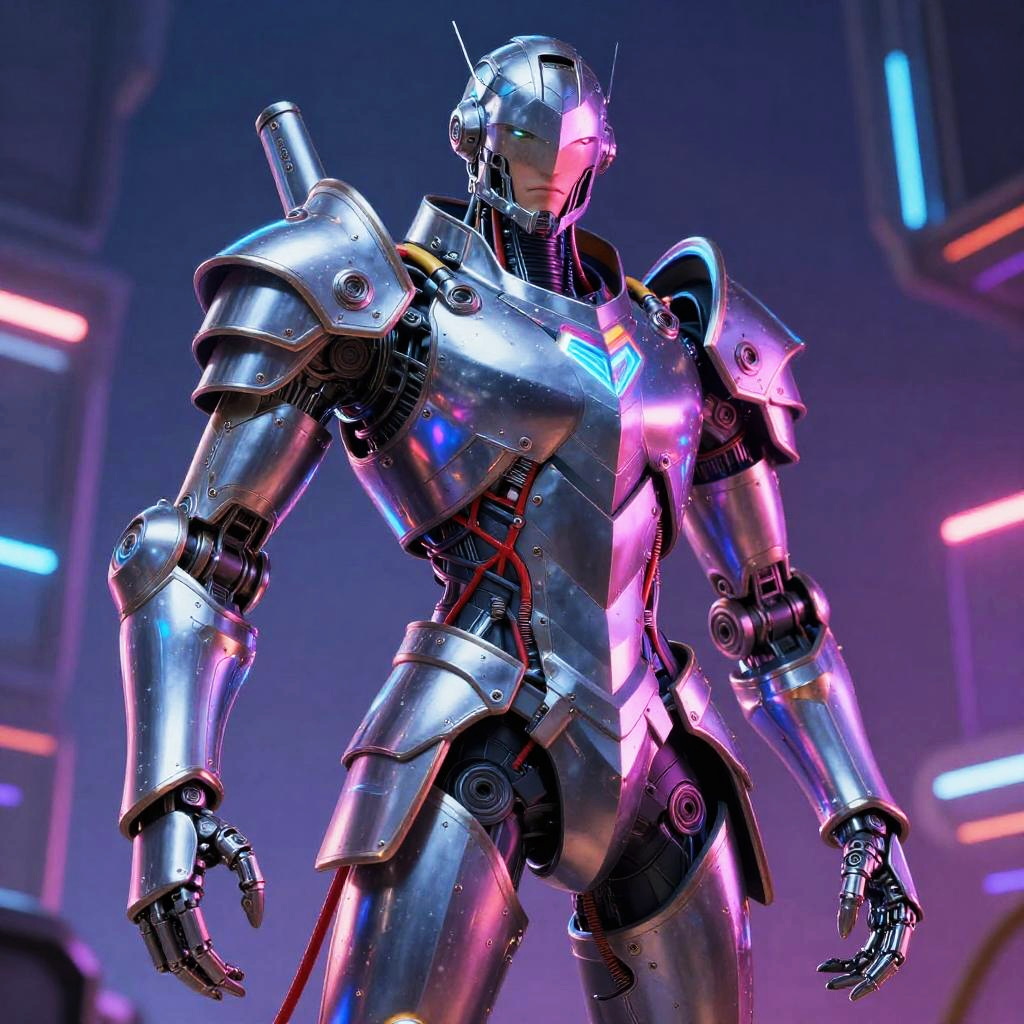 (masterpiece, top quality, best quality, official art, beautiful and aesthetic:1.2), (1man with full armor:1.3), neon lighting, (vibrant glow:1.2), extreme detailed, colorful, highest detailed ((ultra-detailed)), (highly detailed CG illustration), cinematic light, solo, (machine made joints:1.2), ((machanical limbs)), (blood vessels connected to tubes), (character focus), science fiction