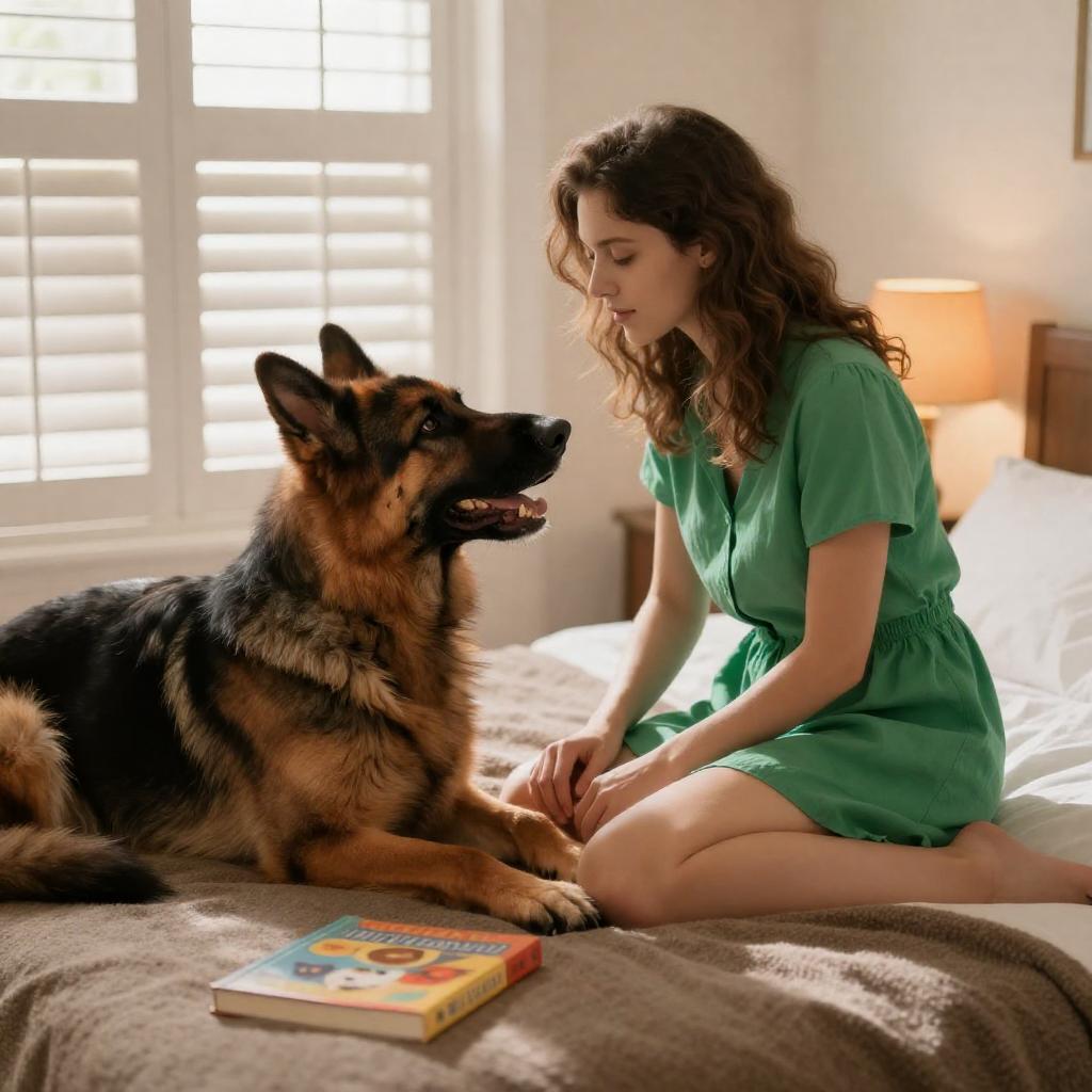 Photograph of a young woman with wavy brown hair, wearing a green short-sleeve dress, sitting on a bed with a brown blanket. She is gently touching her knee while a large, fluffy German Shepherd dog lies beside her, looking at her. A colorful book lies on the bed, and a lamp with an orange shade is in the background. Sunlight streams through white shutters.