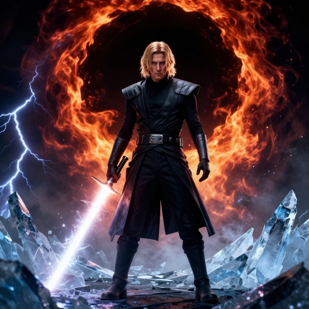 Kylo Ren, (full body ), (ultra detailed), (ultra realistic), RAW photo, HDR, photorealistic, 8k, high res, extremely detailed face, blackhole in background, full body, fire lightsaber, ice light saber, huge dark flames in background, glowing lightning in background, shattered ice, mushroom cloud