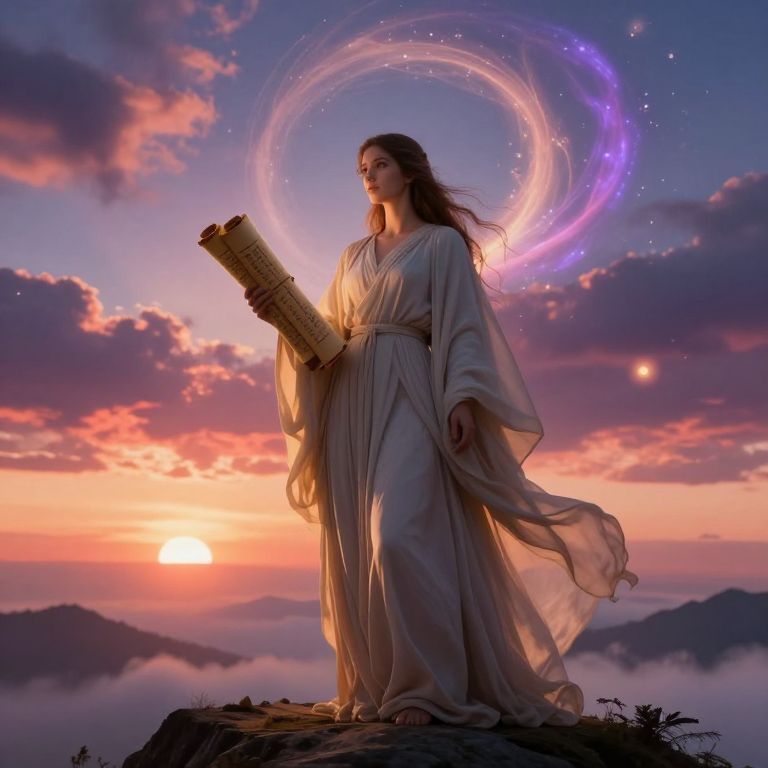 Digital artwork of a serene, long-haired woman with fair skin and delicate features, standing on a rocky mountain peak at sunset. She wears a flowing, white, ancient-style robe and holds a rolled parchment in her left hand. A glowing, circular, purple and pink celestial halo floats behind her head. The sky is vibrant with pink, orange, and purple clouds, and the sun sets in the background, casting a warm light. The landscape below is shrouded in mist, with dark silhouettes of mountains. The image combines fantasy and ethereal elements with realistic textures and colors.