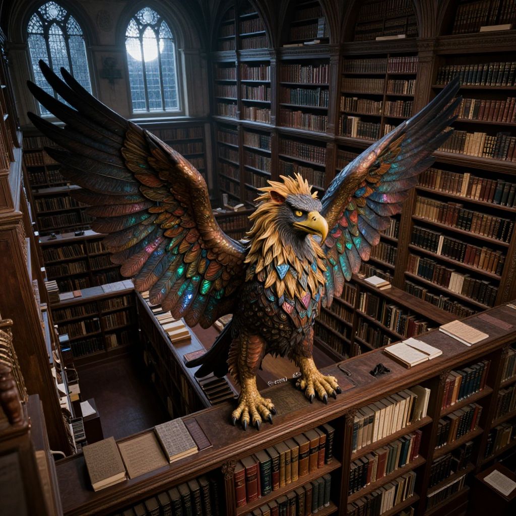 Photorealistic digital art: A majestic griffon with multicolored feathers and large wings stands on a bookshelf in a dimly lit,