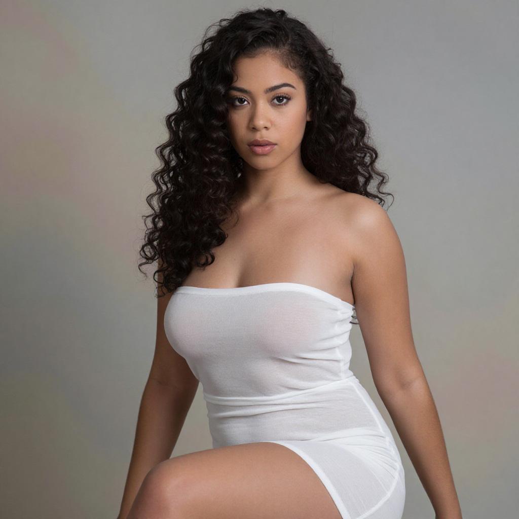 Photograph of a young woman with medium brown skin and large, voluminous, curly brown hair styled in two high puffs. She wears a colorful, striped bikini top that accentuates her medium-sized breasts. She stands outdoors in bright sunlight, with a blurred green and blue background. Her arms are crossed over her chest, and she gazes directly at the camera with a slightly pouty expression. A bright lens flare is visible in the foreground.