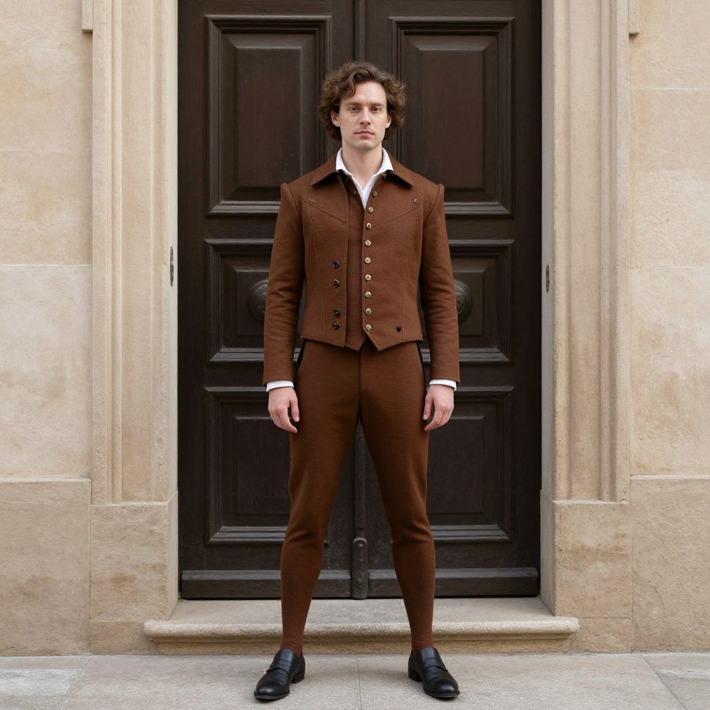 Photograph of a young man standing in front of a dark brown, double-door entrance. He has curly brown hair and a serious expression. He is wearing a brown, button-down, fitted suit with a white shirt and black shoes. The suit has a slightly textured fabric and a modern cut. The background consists of a beige stone wall with a rectangular stone ledge at the base of the door. The lighting is natural, highlighting the textures and colors. The overall style is formal and elegant.