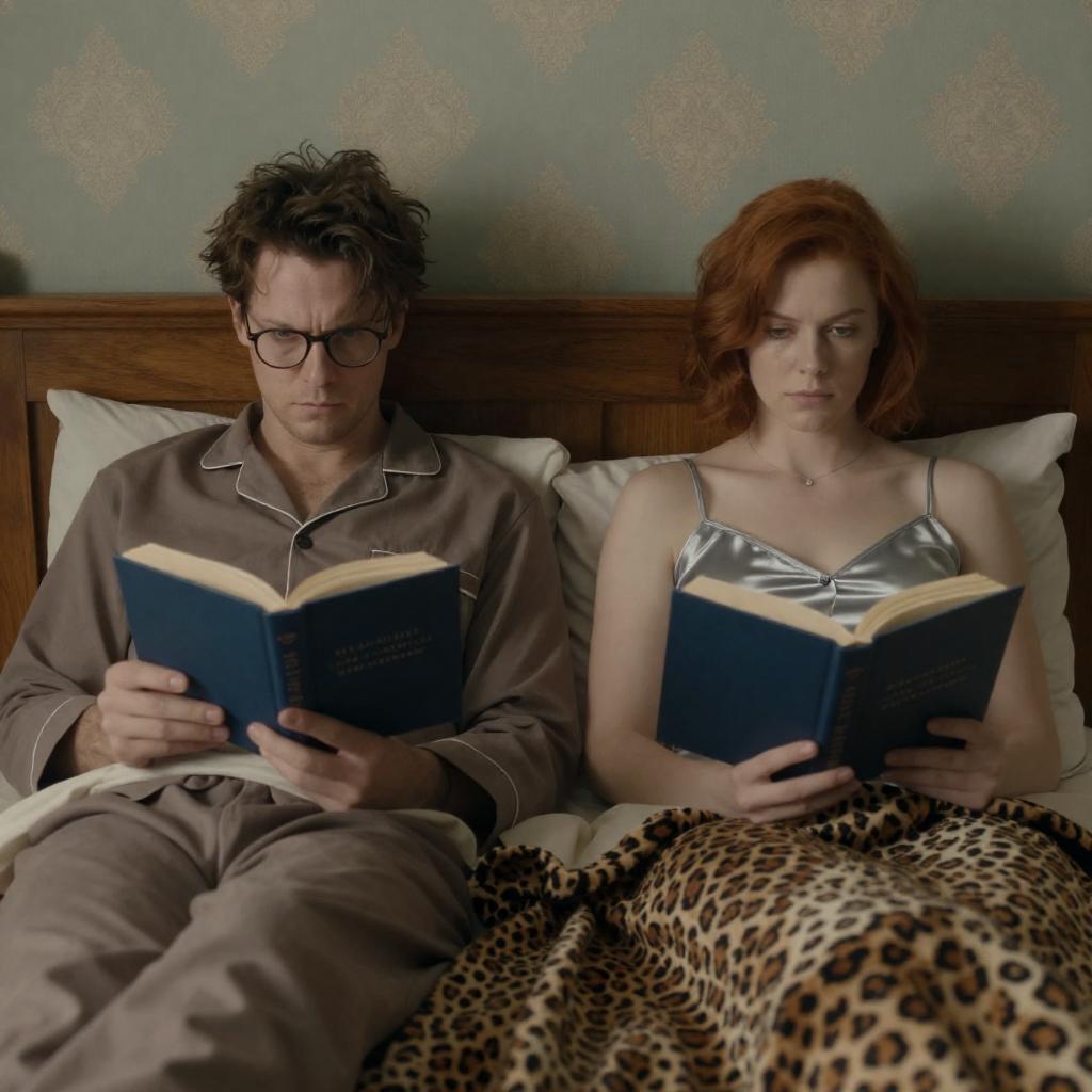 Photograph of a man and woman in bed. Man with short dark hair, grey t-shirt, lying on left, looking surprised. Woman with long red hair, black lace top, sitting up on right, looking concerned. White blankets, wooden headboard, blue wall in background.
