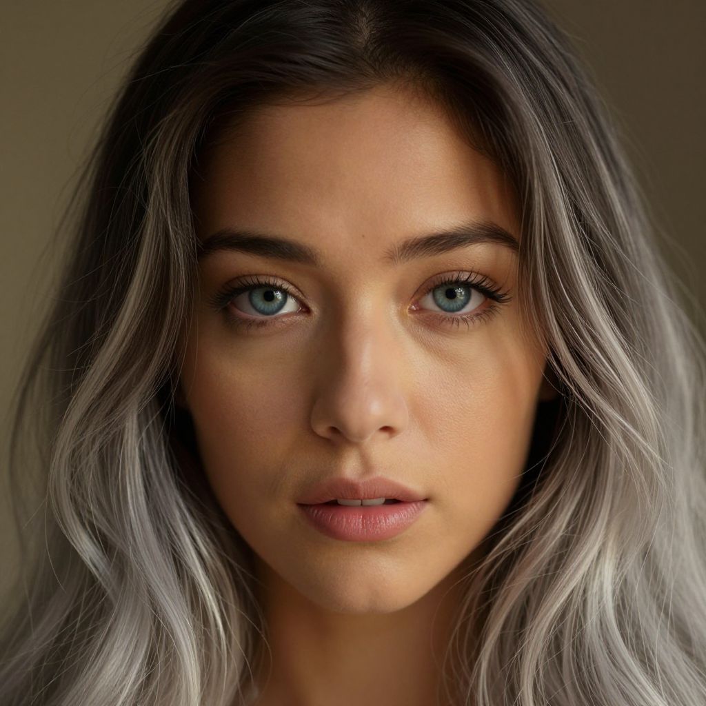 Photograph of a young woman with fair skin, blue eyes, and long, wavy silver-gray hair that has darker roots. Her face is centered in the frame, looking directly at the camera with a neutral expression. She has well-groomed eyebrows, subtle eyeliner, and natural-looking pink lips. The background is blurred and dark, focusing attention on her face. The lighting is soft, highlighting her clear skin and the gentle texture of her hair. The overall style is natural and minimalistic, emphasizing her striking eye color and serene expression.