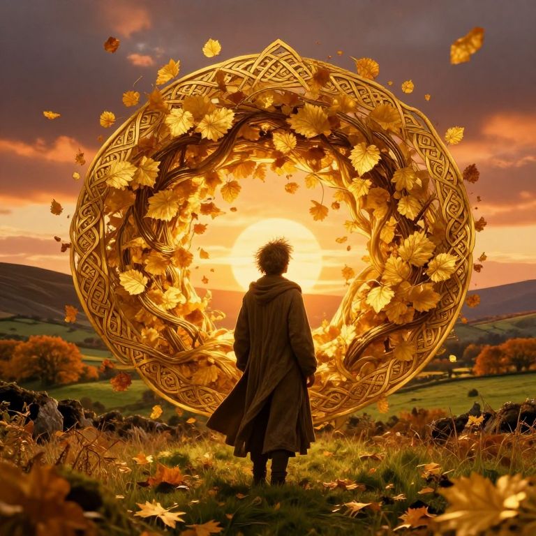 Photograph-style digital artwork of a person with curly hair, wearing a long brown coat, standing with back to the viewer in an autumnal field. They face a large, glowing circular wreath adorned with intricate Celtic patterns and golden autumn leaves, set against a dramatic sunset sky. The sun, positioned behind the wreath, casts a warm, golden light. Surrounding the figure are scattered autumn leaves and a rolling landscape with hills in the distance, adding depth and texture to the scene. The overall mood is magical and serene.