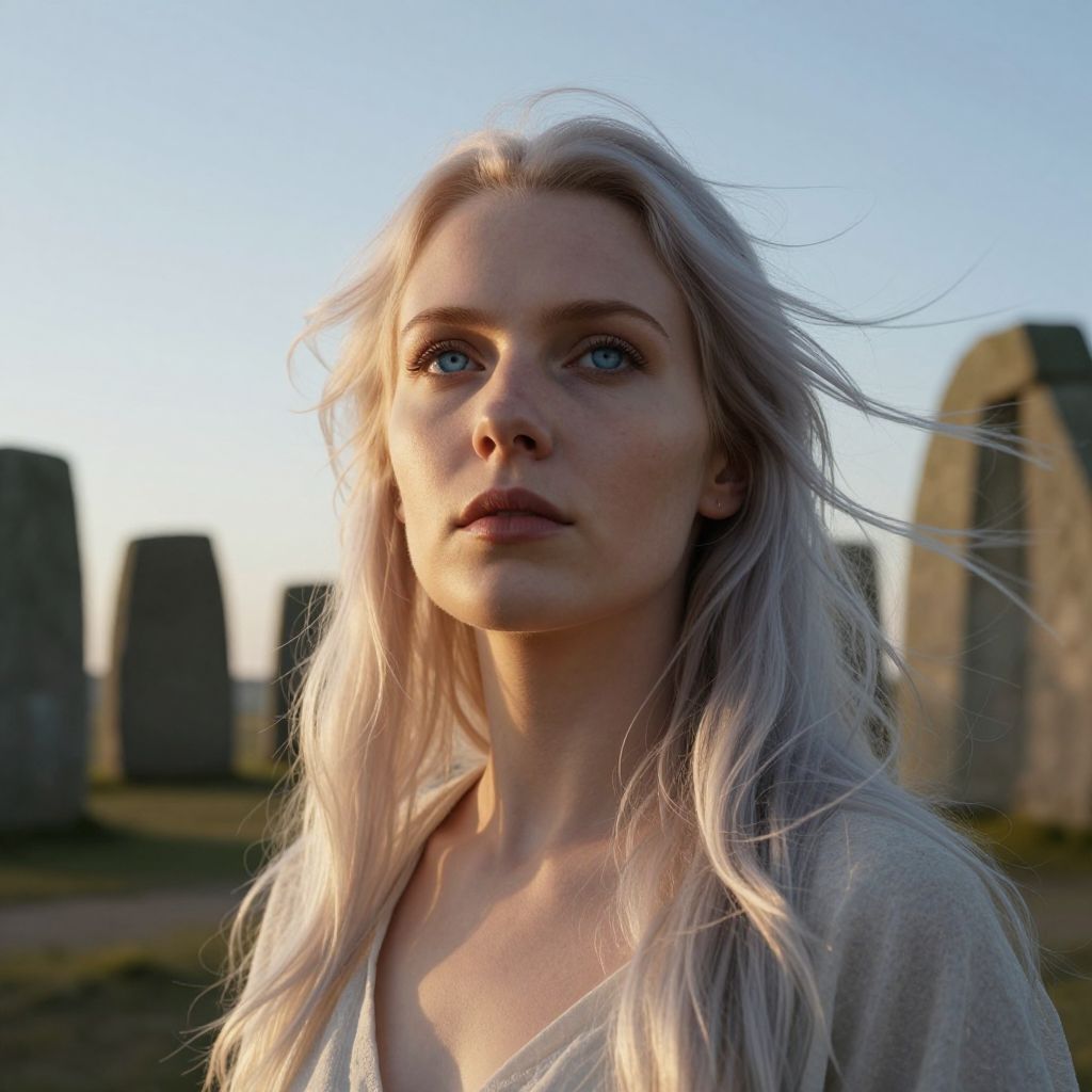 Envision a captivating portrait photograph featuring an ethereal Nordic woman with piercing ice-blue eyes and fair skin. Her long platinum hair flows gracefully in a soft breeze, adding to her enigmatic allure. Captured from a dramatic worm's-eye view, the image showcases her serene yet mysterious expression amidst an ancient stone circle bathed in warm golden light at dawn. The interplay of shadows and highlights on her features evokes awe and wonder, seamlessly blending contemporary fine art portraiture with prehistoric symbolism. This hyperrealistic masterpiece transcends time and space, creating a visually stunning and emotionally resonant experience.