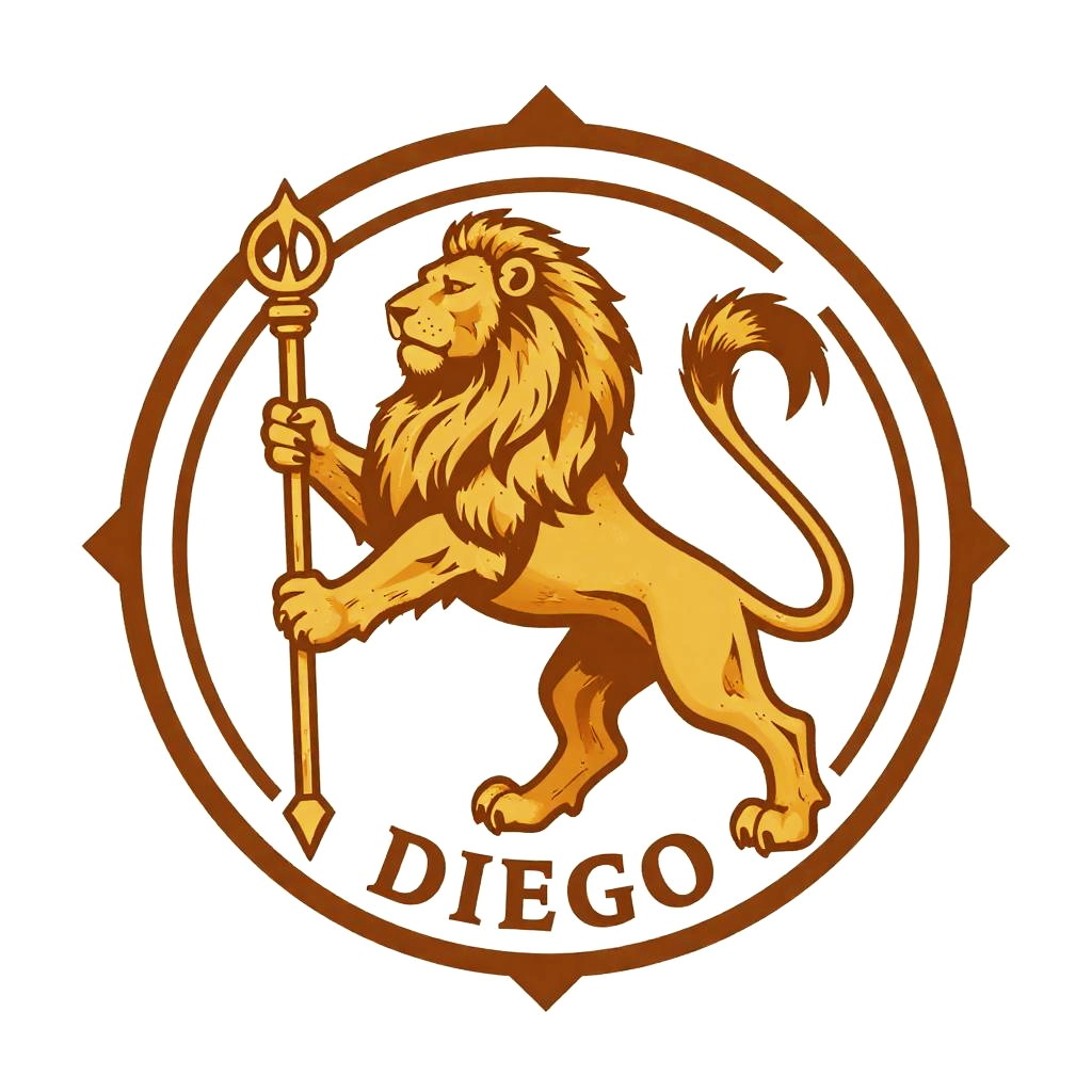 Art logo with lion and scepter, regal style, in the style of Diego Rivera, three-quarter view, majestic and ornate, rendered in 8K.