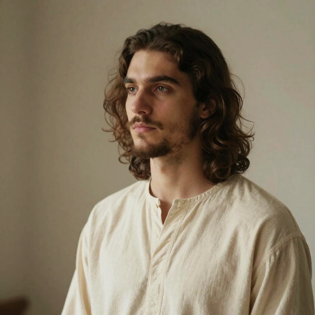 Photograph of a young man with long, wavy brown hair and a full beard, wearing a simple, cream-colored, loose-fitting tunic. He has a fair complexion and is gazing thoughtfully to his left with a calm, introspective expression. The background is a softly lit, neutral-colored wall, creating a serene and contemplative atmosphere. The lighting highlights his facial features, adding depth to the image.