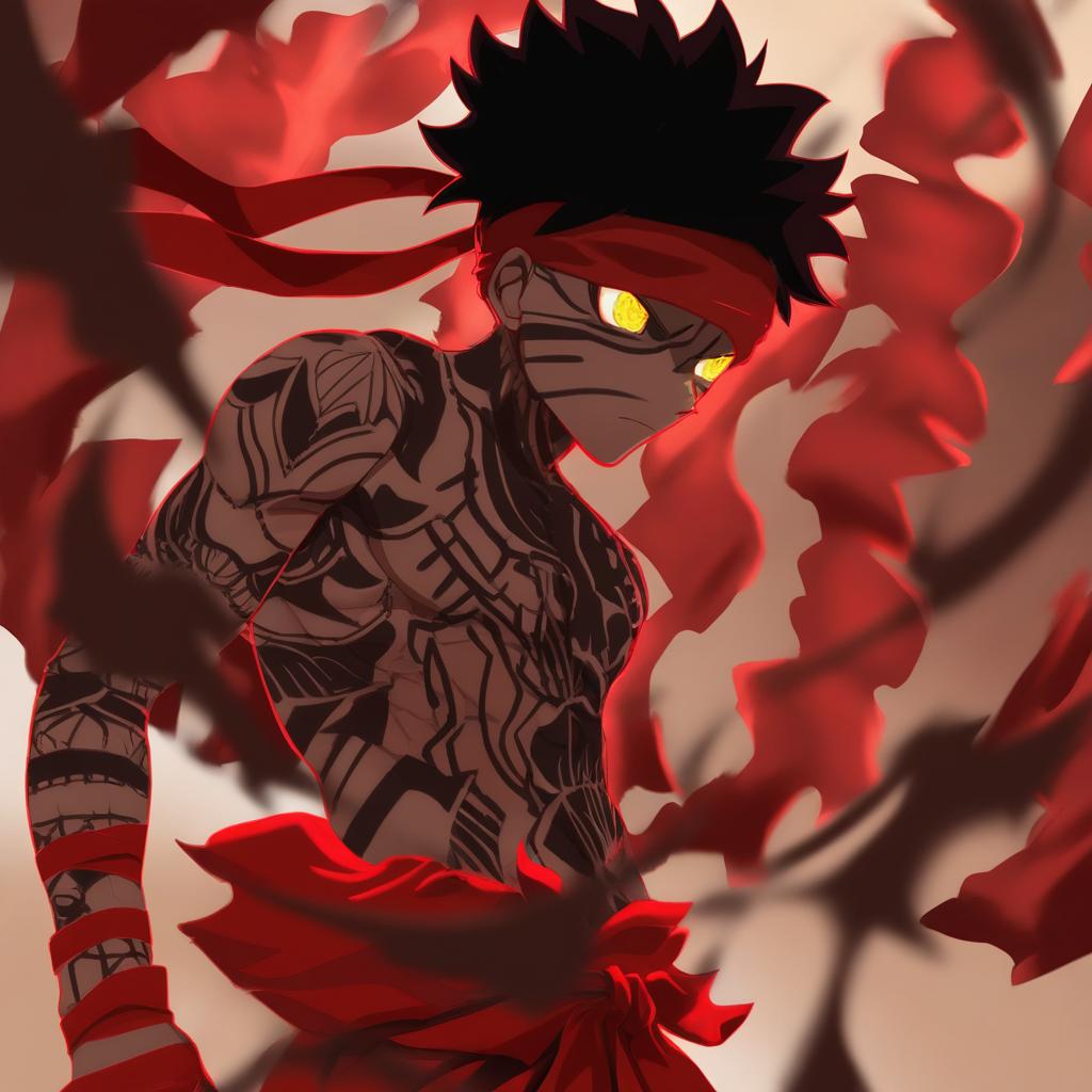 A digital anime-style illustration of a dark-skinned male character with striking yellow eyes and spiky black hair. He is topless, revealing intricate full-body black tattoos. The character wears a red headband and has red fabric elements swirling around him, creating a dynamic and intense atmosphere.